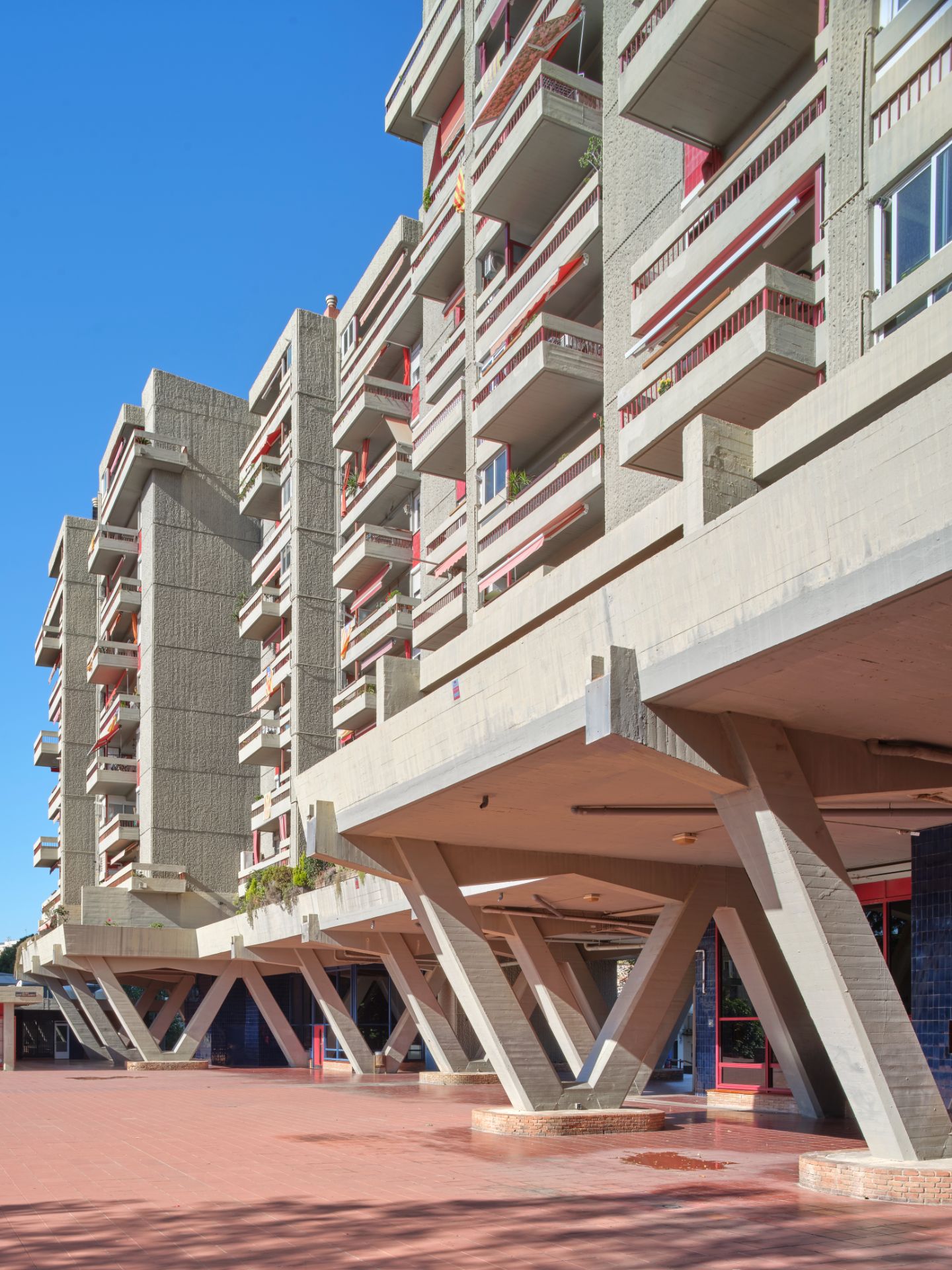 Uno de los rasgos distintivos del diseño es el contraste entre el hormigón armado visto y los brillantes revestimientos cerámicos, los pavimentos rojizos y las cubiertas ajardinadas de los bloques bajos, que actúan como paisaje visual para las torres.